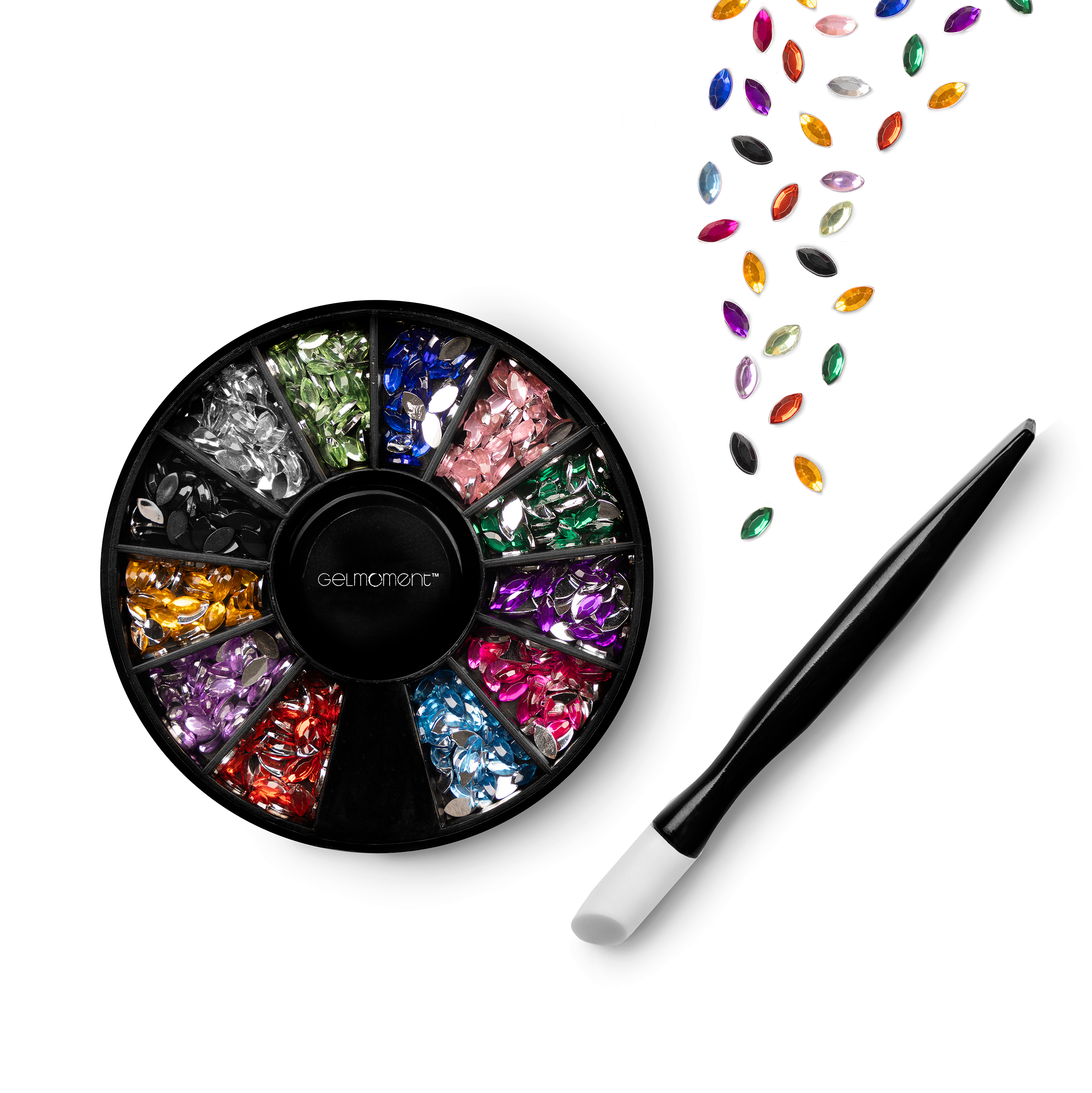Marquise mini jewels comes with 12 colours and and applicator stick, and comes packaged in a GelMoment organza sachet.